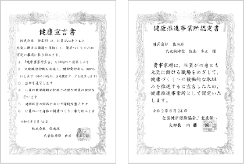 佐南組は、2020年6月に「健康事業所宣言」を行い、健康推進事業として認定を受けました。